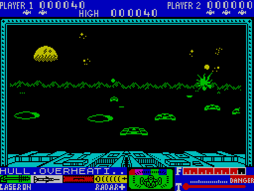 At any time you may be attacked by Seiddab hover fighters. Your craft is also armed with air-to-air missiles which will destroy the enemy fighters before they come into range, although when they are sighted the lasers must be used. Weapon selection is automatic, below the horizon it’s lasers, above it’s missiles.
