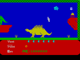 Each screen consists of large fixtures like trees or dinosaurs (some of which may animate a little) and smaller, moving graphics. Tunnels and recesses have tended to replace the familiar platforms. The graphics aren't really up to Jet Set Willy standards and the difficulty I had controlling Wilf's spritely extravagances spoiled any appeal that the game had. 2/5