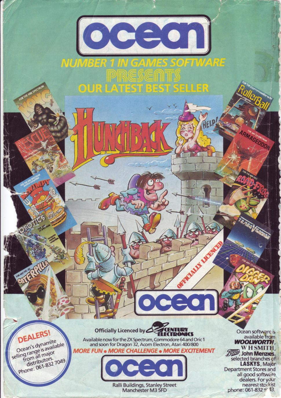 ENTHUSIASTS for the popular amusement arcade game Hunchback will enjoy the version from Ocean Software. You are Quasimodo, the notorious Hunchback of Notre Dame, who in legend rang the bells of the famous cathedral. In the game you have to rescue your sweetheart Esmerelda, who is imprisoned in a tower on the cathedral battlements. You perform the selfless deed by leaping over fireballs, swinging on ropes and ringing the bells, pursued all the time by a tenacious French soldier.