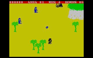 Right from the start, the pace is hectic. Advancing steadily along the scrolling landscape, you are assailed on all sides by soldiers who come at you from behind sandbags, boulders and palm trees or leap down on you from the top of tufted hillocks. The bullets fly, the hand grenades and the dynamite rain down, and with all the explosions it is a bit like firework night. Any stray bullet or hand grenade can make you lose one of your five lives, and you must keep dodging and firing every inch of the way.