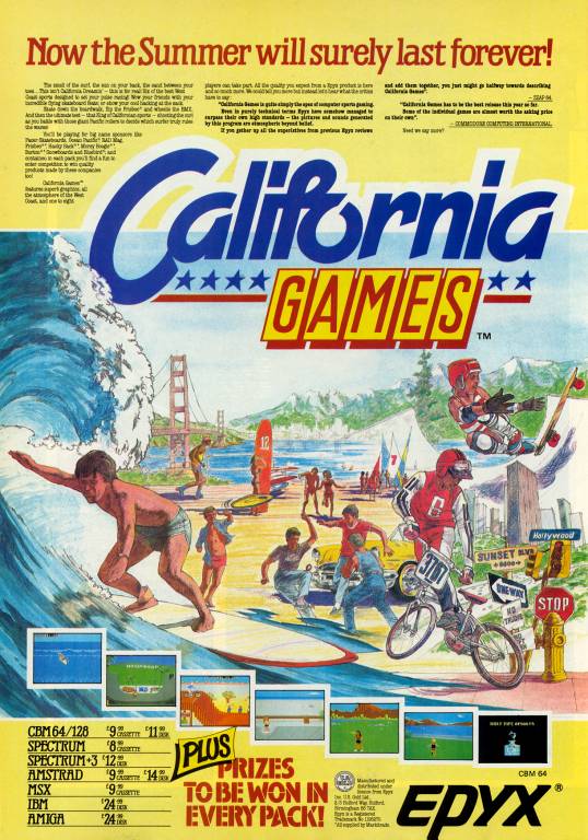 Wiki (Unknown) 6th Dec 2016 11:34California Games is a 1987 Epyx sports video game for many home computers and video game consoles. Branching from their popular Summer Games and Winter Games series, this game consisted of some sports purportedly popular in California including skateboarding, freestyle footbag, surfing, roller skating, flying disc (frisbee) and BMX.