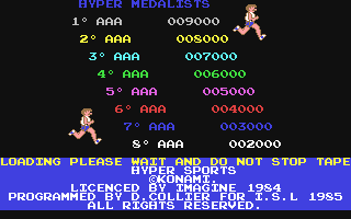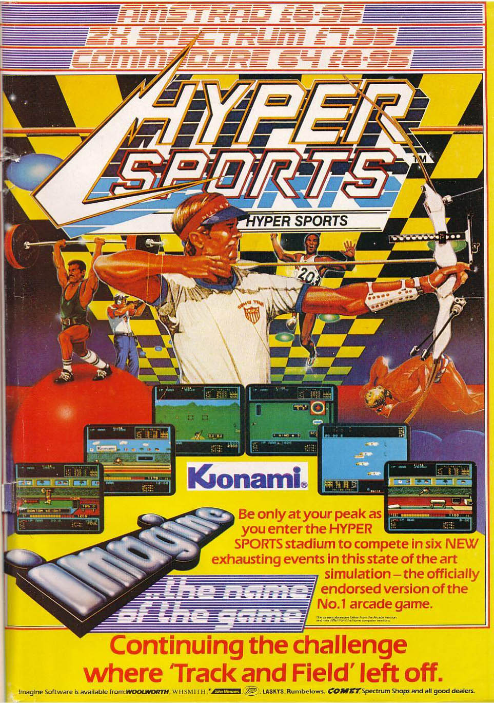 Here it is at last . . . the long awaited Hyper Sports. The game was a follow up to the huge arcade (and much copied) hit Track and Field. There is the same sort of scoring, and the same gameplay still applies. In each event you have a certain target which you have to reach to qualify. If you don't meet this requirement then your game will end, if on the other hand, you do then you'll automatically move on to the next event.