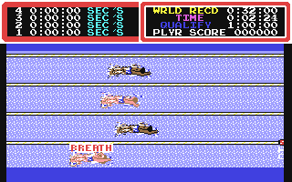 The game kicks off with an exhausting freestyle swimming event. This is similar in style to the 110 metre hurdles in Track and Field. You have to belt along by hurling your joystick from side to side and when the prompt 'breathe' comes up press the fire button. Don't leave it too long to press fire, otherwise your man will slow up completely and don't press the fire button when your man's head is underwater because, not unsurprisingly, this causes him to cough and splutter and slow up for ages (enough to cost you the race).