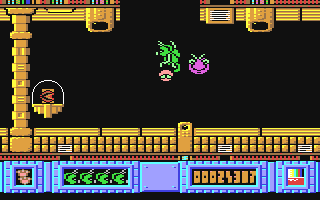 Once you've completed the flight stage you're automatically transported to the second part of the course, a sort of mini Arc of Yesod with a jet pack. What you have to do is make your way around a large, flick-screen map and find four bits of the computer. When you find a piece it can be picked up by blasting the top off its container and moving your man over it. When all four pieces have been recovered, locate the central computer room and assemble them there to complete the training. Sounds easy, but the complex is infested by horrible aliens which sap your energy when they touch you. If they stay close for too long then you lose a life. Luckily they can be shot; just press fire to blast them to bits. He he he.