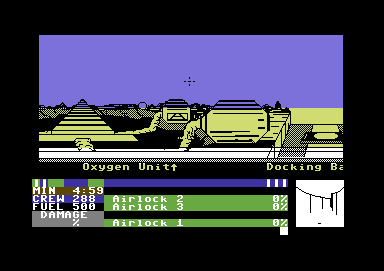 The action all takes place on a huge base on the planet of Betula 5. The planet’s atmosphere is not compatible with humanity, so the base is sealed within its own life support system. The base has an inner ring from which radiate the various surface installations. These are the medical centre, freezetime generator, oxygen unit, docking bay and teleport centre, recycling unit, pleasure dome, crew quarters, fuel dump, power plant, matter disruptor and the food store. The game provides 10 screens which are views of the base, seen from the centre and all the way round.