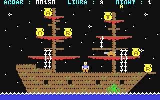 The game is split into two styles of game, a platform game with the whole level shown on one screen and a horizontal scrolling game viewed from the side. The platform sections see you in various locations and you must collect six jugs with the letters to spell the word Arabian which must be collected in the correct order. You can climb ladders and ropes while jumping up to higher platforms. Don't fall too far as this will kill you. The scrolling sections are between the platform levels and the first one sees you on a raft avoiding crocodiles or falling rocks. The other sections you fly on magic carpets avoiding other carpet flyers and nasties.