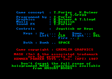Publisher: Genre: Author(s): Musician(s): Graphics Mode: Minimum Memory Required: Maximum Players: Joysticks: Language: Media Code: Media Type: Country of Release: Related Titles: Comments: | ![]() Shoot 'em Up Tony Porter, Kevin Bulmer, Stuart Gregg, Terry Lloyd Ben Daglish, Tony Porter Game zone in Mode 0 (16 colours), Info zone in Mode 1 (4 colours) 64K 1 Yes Eng N/A Audio cassette Europe Mask 2 Mask 3: Venom Strikes Back | Click to choose platform: Amstrad CPC Sinclair ZX Spectrum ![]() |