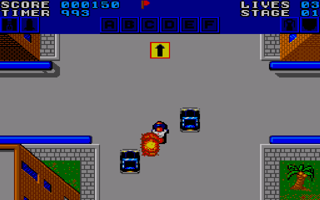As you drive along, you have to enhance your vehicle. This is done in two ways. Firstly, you climb aboard the weapons vans that appear at random intervals and give you, in order of appearance, double shots, a missile for shooting helicopters, rear fire and temporary invulnerability.