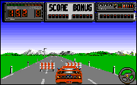 The graphics in Crazy Cars II are of an unusually high standard for a racing game. The vehicles are large, crisply defined and well-animated (especially the 360 degree spin). The roadside graphics are not very varied but they do move very smoothly indeed. Likewise, there is very little variety in the vehicles, only the Ferrari and the police cars are ever seen.