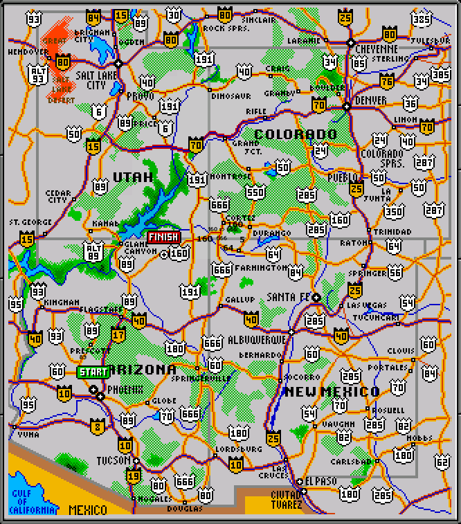 In your quest you will tear across four states of America at speeds high enough to arouse the attention of honest and corrupt policemen alike. You must plan your route from start to finish using the maps which show actual American roads. Make us of slip roads and short cuts to beat the time limit.