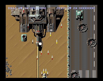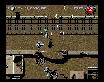 The best thing about this game is co-op. Before there was TimeSplitters 2 and The Warriors (Bugs Bunny & Taz too, if you're as crazy enough as myself to like that sort of stuff), Swiv brought some solid two-player simultaneous combat to the world. Sure, virtually every other shmup did the same, but Swiv was unique in that one person would control the helicopter and the other would be riding along in the jeep. The helicopter pilot would be tasked with maintaining air superiority (just like with your typical vertical-scrolling shmup), blasting away at everything in sight whilst avoiding shining bullets and other hot ammo that present as one-hit kill hazards. Player one (you can choose sides, though) has the easier ride of the two. Player two who stays close to the ground has to manoeuvre around buildings and land-based cannons, not to mention steaming locomotives. As compensation, the jeep driver can shoot multi-directionally, strafe-firing as needed. Plus, he can also perform semi-cool jumps across rubble, or if feeling lucky, leap right over those trains. Awesome!