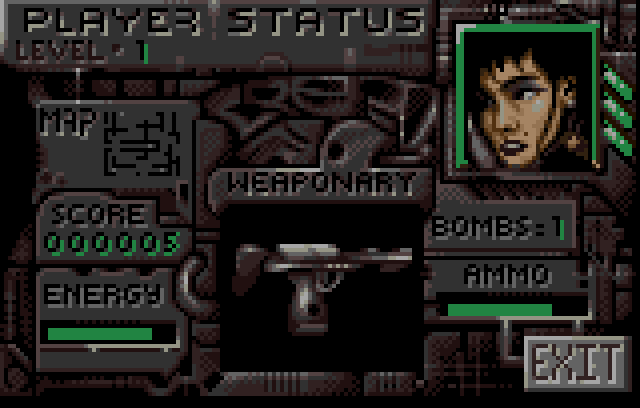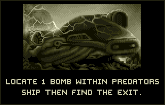 Depending on the character you select, you'll be armed with three weapons that you can select from by pulling up a status screen. The type of weapons you start with differ between the Predator and Marine. In addition, ammunition, bombs and energy power-ups are scattered throughout the ship. The status screen also lets you view an overhead map of the ship, and check on ammunition, energy, and points.