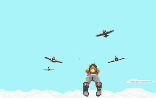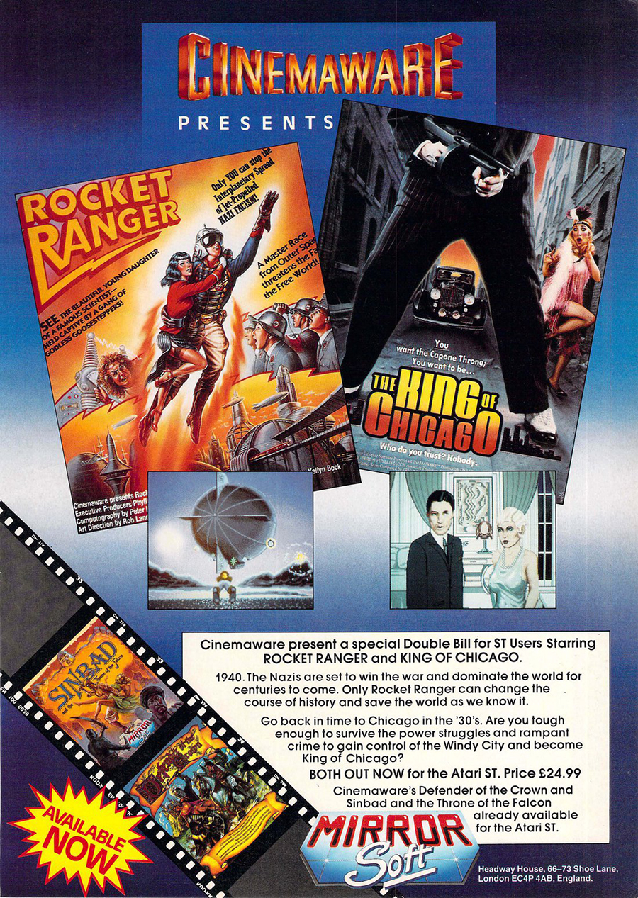 Like many Cinemaware games, Rocket Ranger draws its inspiration from Hollywood, and likely The Rocketeer comics. This title pays homage to the many 1950s sci-fi serials, using the look and feel of the serials, including action-packed cut-scenes and an art treatment loyal to the futuristic visions of that era. It also features the cliché elements of that era, including a dashing, courageous hero and a beautiful, voluptuous damsel in distress in need of rescue.