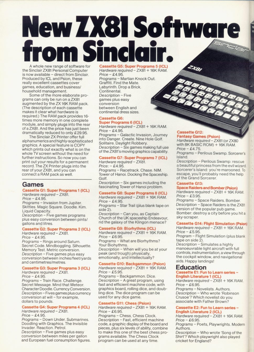 | Publisher: Genre: Author(s): Minimum Memory Required: Maximum Players: Joysticks: Language: Media Code: Media Type: Country of Release: Other Files: Comments: | Sinclair Research Ltd Simulation - Flight Psion 16K 1 - Eng G14 Audio cassette UK Advertisement | Click to choose platform: Sinclair ZX81 Sinclair ZX Spectrum |