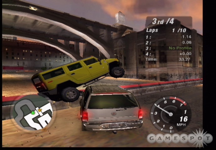 Many races, rather than beginning with a countdown, feel the best way to achieve the ghetto feeling to have a person motion for the start while standing on the starting line. This dishes out a unique trick, as the type of person may vary when it is best to begin revving the car up. When the race begins, expect the AI, whose difficulty can be varied in any mode, to fly into the lead. While this is initially discouraging, the longer the race, the more mistakes that the AI will make. While the AI could be ahead at the start of the second lap, it is perfectly feasible to take the lead with almost ten seconds to spare before the race meets its end. The corner of the screen constantly shows how far ahead or behind the opponents are, which can be very helpful when the heat is on near the end of the race.