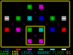Each screen has a set of blocks, of different colours. All you have to do is swap them around into columns of one colour each; the colour for each column is shown at the bottom. You control a frame which can contain four of these blocks at time; this can be moved about the screen, and fire and left or right rotates the colours in either direction. Don't worry about the appalling explanation; the idea is incredibly easy to pick up.