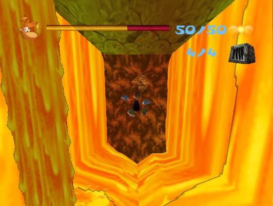 Rayman's fists are not the only weapons in his arsenal, however. He can chuck plums at foes, detonate explosive kegs, and hitch rides on walking barrels. The enemies are no pushovers, however, and actually make for quite an impressive challenge. (As pirates, they are able to get away with being brutal.) Failure to dodge enemy fire will result in your health bar taking a dive. Occasionally you will come across one of your lost friends caged in a precarious situation. Free enough of them and your health bar will increase. The game is not merely pure platform action, however. There is puzzle-solving abound, ready to test the very mettle of your mind. Many of these puzzles do not have obvious solutions, forcing you into a game of trial and error. While the game may have a somewhat childish appeal, a few of these dilemmas will have grown men banging their heads against the wall. In numerous stages, you will be pitted on some form of vehicle, such as a water ski or a rocket, while dodging obstacles in your wake. While these gimmicks can be fun little diversions, they have a tendency to be annoying to handle at times.
