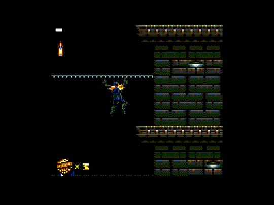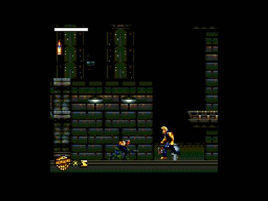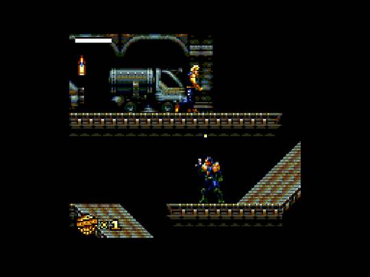 Level designs are appropriately labyrinthine, offering us some good exploration. The levels here are just the right size. Not too large, not too small. There are plenty of secret areas to discover with ammo caches, power-ups, and extra lives. In addition to running and gunning, Dredd climbs ladders and uses lateral hand-over-hand bars to get around. He also has to ride moving platforms over abysses and floor hazards. There are some parts during late-game that I don't care for all that much, such as when he has to traverse an area full of spikes on the walls, floor, and ceiling, using moving platforms to get around. But these parts are brief enough that I can forgive it.