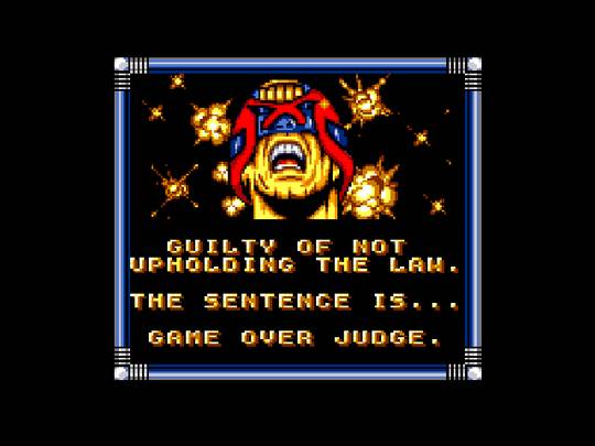 Background music is pretty good. There's nothing annoying here. Most of it fits the scene well, setting an appropriate mood while managing to be unobtrusive. I like the theme for underground caverns, and music during boss encounters is appropriate to the scene. Sound effects are about as good as they're going to get on the Game Gear. Everything has an appropriate effect, from Dredd's footsteps to grenades exploding. Some of the bullets have lackluster effects, but that's better than if they had annoying effects. An effect accompanies the disarming and arrest of a bad guy so that we're not left wondering if we were successful (if you don't arrest him right away, he'll pick up his dropped weapon and resume his assault). Effects also alert us that we've completed primary and secondary objectives. I think the effects in this game are all well done. There's nothing here that grates on me.