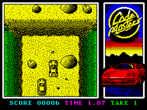 This game has CodeMasters written all over it - and not only on the packaging: the graphics and music are instantly recognisable. The small but excellently drawn sprites complement the obstacles and backgrounds, with colour being quite generously used. All the presentation is superb, animated title sequences, full screen display (no more ugly black borders) and a great border in the game itself. The music, unfortunately, is not the best I've ever heard and the effects do leave a lot to be desired.