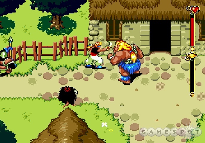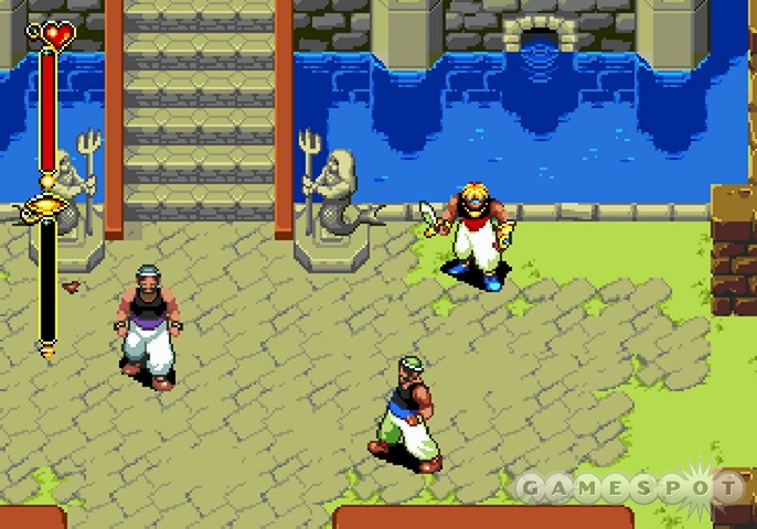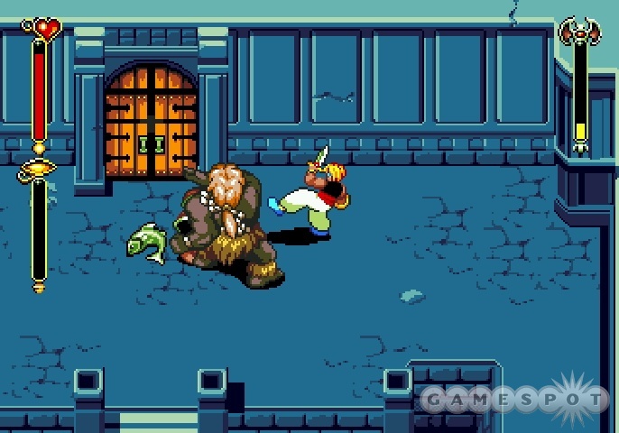 The Story of Thor has a simple but intuitive style of play. As you control Ali, you start with a dagger, which never ever loses its sense of usefulness due to the wide variety of moves Ali can perform with it. Soon you can pick more powerful weapons such as swords, bows and even bombs. However, your inventory only allows you to carry seven additional weapons at a time, so you may want to consider whether you need a weapon before picking it up (if you have one that's more useful, I mean). It is a bit dodgy how the jump button also makes Ali crouch - if you press it lightly, he jumps, but if you hold it down, he'll just crouch - but this becomes second-nature in a flash.
