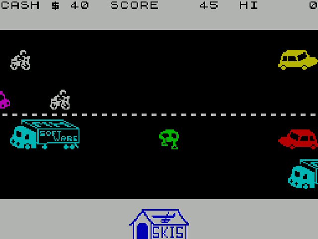 Horace could not enter the ski hut unless he could afford the hire charge. If Horace had spent all his money on ambulance fees, then it was possible to accumulate points and money by crossing the road repeatedly - very dangerous. At every 1000 points scored Horace received a $10 bonus.