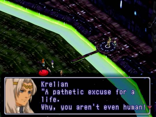 Xenogears has a more adventurous type of gameplay. In dungeons and towns, you are allowed to jump around, and search everywhere. Usually dungeons are huge (and I mean HUGE) labyrinths filled with twists and turns that will leave your head boggling. I remember I got stuck in one of the dungeons at the end of the first disk for more then 2 hours once. It is not a good thing, so for those of you who are not patient, you may want to use a strategy guide.