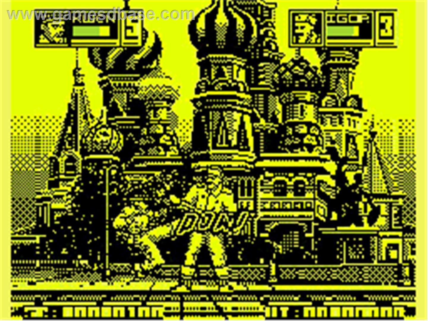The idea is to bash up a load of Johnny Foreigners on their native soil, or in kinder terms, to 'stamp your supremacy over a multitude of opponents' as it says in the inlay. Glasnost hasn't reached US Gold yet apparently, as you begin your headbutting holiday in Russia, amongst the sacred Temples of Moscow facing Igor, a commie soldier with a huge sword. Once you've well and truly pummelled him, his dog Shep-ski, attacks you. Well, I say dog, it looked more like a sheep to be honest.