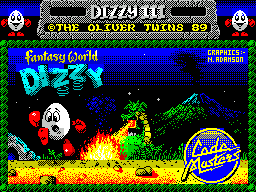 Everyone’s favourite computer game character has returned again with another action packed adventure from CodeMasters. Yes it’s Dizzy the egg in Fantasy World Dizzy (or Dizzy III). Somehow Dizzy has acquired himself a family of little yolkfolk, and they’re all in the game to help him along, except one. Daisy, Dizzy’s girlfriend has gone and got herself kidnapped in the fantasy world of evil dragons, ferocious alligators and magic spells galore. She’s kept in the cloud castle, and it’s poor old Dizzy’s job to rescue the damsel.