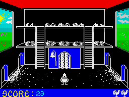 Set in a henhouse with two doors to the outside world on the left and right walls, a central "bedroom" and two nesting platforms against the back wall, the idea of the game is to keep Madam Chicken satisfied by... hmm... well... ahem... doing what Cockerels are best at. All this takes place in her boudouis BEHIND A CLOSED DOOR. For every... hmm... thingybob ... you do (takes a few seconds you know) she'll produce a fertile egg and a heart appears at the top of the screen.