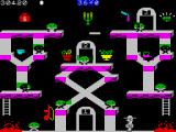 If you manage to touch every platform in the Painter game part, you'll then be promoted to the next screen. And that's where the fun starts. Bounty Bob can take lifts, slide down the longest tracks possible, use the transporters and generally cause havoc amongst the idyllic lives of the nasty green things.
