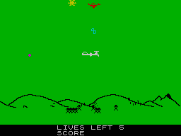 Unfortunately that is not the case it is a slow version of the standard 'stop the aliens dropping the refugees' story. The hilly terrain and spacecraft stand out on a violent green screen which plays tricks on the eyes, making the game difficult to play. The aliens look as if they have been imported from the Imagine Arcadia.