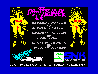There are no cheats on file for this title. | Bob Wakelin's cover art was inspired by bodybuilder and Playboy model, Lisa Lyon.The character Athena was later resurrected by SNK for appearances in several Neo-Geo King of Fighters games, as well as SNK Gals Fighters on the Neo-Geo Pocket.Mark Jones began working on Athena after finishing Wizball. Shortly after, Mark was transferred onto Gryzor and Athena was completed by Ivan Horn and Andy Deakin. |