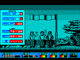 Keep an eye on the four gauges at the bottom of the screen too - if you ruin your tyres (by skidding), your body (by hitting things) or your engine (by staying at maximum speed) - or indeed if you merely run out of fuel - the game will end. (It'd be best to take a trip to the garage before any of them get too low, wouldn't you say?)