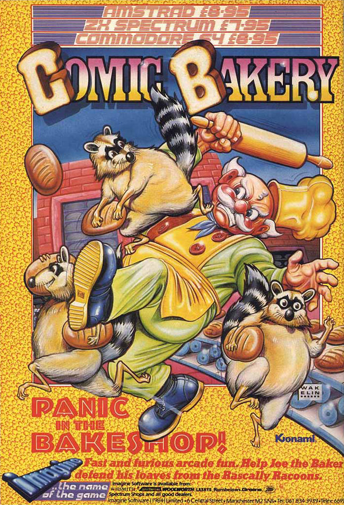 Issue 12, March 1986 (Zzap! 64) 18th Mar 2013 03:16Latest in the saga of Imagine's acquisition of 64 conversion rights to Konami arcade games is the release of Comic Bakery. The scenario, as with a most Japanese originated ones, is a bit strange. Joe the baker has to bake as many loaves as possible and get them to the baker's shop before the five o'clock van leaves. What's so strange about that you ask? Well, for some totally unaccounted and probably strange reason, racoons have broken into old Joe's bakery and have taken it into their heads to disrupt, disturb and generally hassle the old man. Obviously not an animal lover by any degree, Joe has equipped himself with a stun gun to cope with the pesky Procyon lotor. Any racoons passing Joe's path get a stun blast and are kicked off the screen before they get a chance to reawaken.