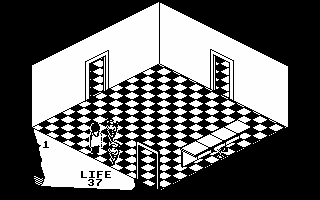 There are quite a few weirdoes residing in the castle and all of them deplete Isvar's life force if he touches them. This life force is displayed on screen as a counter which starts at 99 and diminishes as he gets beaten up. He can fight with his trusty sword, although not all of the nasties can be prodded to death. Luckily the hero can top up his life force by eating (using) the food and wine which can be found around the castle.