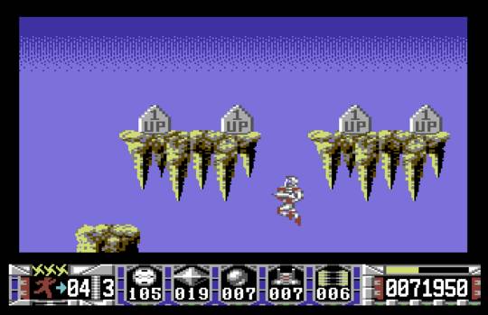 But this isn't to come without the games drawbacks. On the negative side, the commodore 64 holds an awful framerate at some instance you'd be dumbfounded how Turrican could even run on that old machine. This game just feels too slow for the kind of jump-in-the-fray gameplay it delivers. I guess I was a bit spoiled for playing the amiga one first, so for the time that this only existed, I could have seen myself more accustomed to it. But it really makes it hard for me to want to come back to this one, knowing there is a more advanced version, but for those oldschool gamers who like Turrican, shooters/action platform games of any kind, or who own a C64 and have no idea what to do with it, I have to recommend this atleast one playthrough. Not only are you experiencing the roots of the series, but it also had some minor alterations from the Amiga game, such as that boss at the end of the first jetpack stage that was dubbed out of the amiga game. Not only that, but the C64 version offered much more of a challenge, even if you do find all the 1-up locations, the game still has plenty of challenge and desire to be left for anybody thinking of mastering this game. Also, for anybody lacking a C64, you can easily find a emulator and finding Turrican for it is just as easy. Getting the emulator to work right and understanding it is abit of a different story though, but ask around in online forums and I'm sure somebody will help you out! That's my Turrican review, so hopefully I've moved some old fans or maybe even inspired some new ones! But don't take it from me; check the game out for yourself and see just why this game is, and always will be one of the top commodore 64 games.
