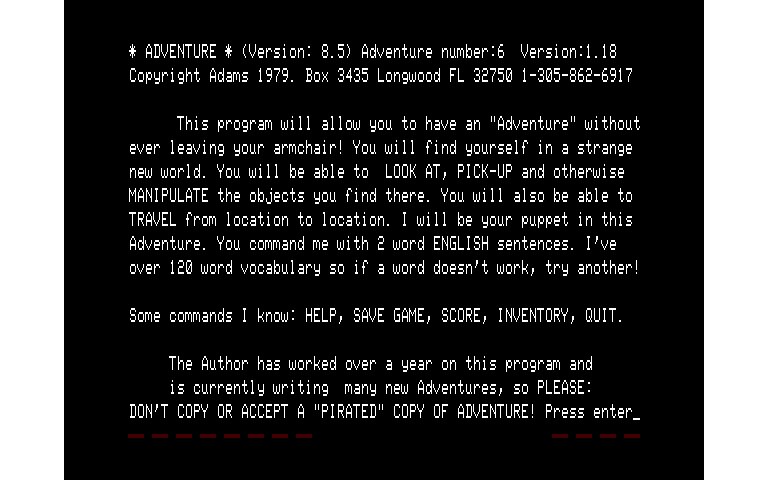 | Publisher: Genre: Author(s): Minimum Memory Required: Maximum Players: Joysticks: Language: Media Code: Media Type: Country of Release: Related Titles: Comments: | AdventuresoftAdventure / Text Adventuresoft UK Ltd, Scott Adams 32K 1 - Eng N/A Audio cassette Europe Adventure 5 : The Count Adventure 7 : Mystery Fun House | Acorn BBC |
