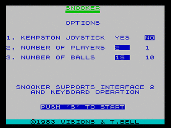 | Publisher: Genre: Author(s): Minimum Memory Required: Maximum Players: Joysticks: Language: Media Code: Media Type: Country of Release: Comments: | VisionsSport / Snooker Tim Bell 16K 1 Interface 2 Eng N/A Audio cassette Europe (£9.95) | Click to choose platform: Acorn BBC Acorn Electron Sinclair ZX Spectrum More from other publishers: Acorn BBC Acorn Electron Amstrad CPC Sinclair ZX Spectrum |