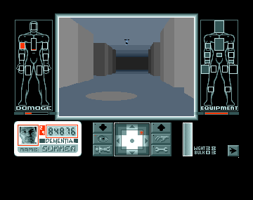 On each side of the 3D screen are two humanoid diagrams. One indicates damage sustained and the other the equipment you are carrying. The damage chart indicates which parts of the body have sustained injury. Get hit in the legs and you will still be able to move but at a slower rate; a hit in the arms will slow up your dexterity in manipulating equipment. If you are hit badly in the chest or head it is lights out and a new game. It is possible to repair minor injuries through using a medi-kit or energy drink or resting up. By clicking onto the various products of the equipment chart, you can see what each contains and you can then choose whether to manipulate the selected piece of hardware.