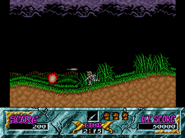The actual gameplay of Ghouls ‘n’ Ghosts is in the same format as its predecessor Ghosts ‘n’ Goblins. Arthur, under your control, runs along leaping across platforms and blasting various spirits. You begin with an infinite supply of sawn-off lances to hurl at attacking nasties, but you can upgrade weapons along the way by picking up pots dropped by skeletons or by opening chests. Occasionally, a magician emerges from these chests and turns you into a bow-tie wearing duck, which is surprisingly useful for dodging the odd particularly annoying flying wotsit thingy.