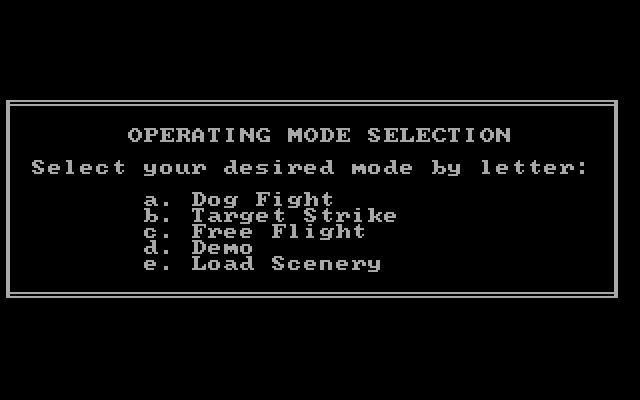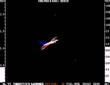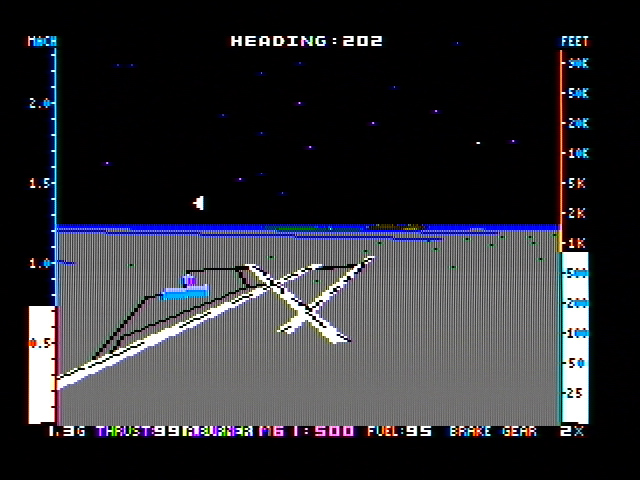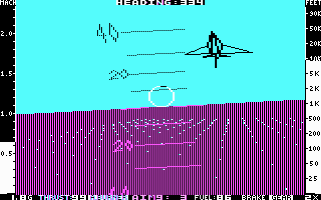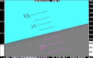 Most of the indicators on a real jet fighter are present in Jet: altimeter, heading, frame loading, gear status, brake status, fuel level, radar, attitude, and range. The player can turn a few of these on and off. The controls consist of either the joystick or numeric keypad for steering and other keys to handle the chosen optional indicators, landing gear, weapons, and a eject button. Different perspectives can be chosen - a view from the control tower instead of the jet's cockpit.