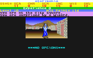 At the top of the screen were character statistics, such as game-world time, Strength, Health, etc. This brings up some of the unique aspects of the game: the character is not omniscient with respect to himself, but has some attributes that stay hidden except in special cases—for example, the player never knew the character's alignment (good/evil/neutral), and poison, drunkenness and disease tricked the perceived stats, or temporarily or permanently changed them. In fact, the player never chose an alignment, but came to learn it through how other characters treated them in the game.