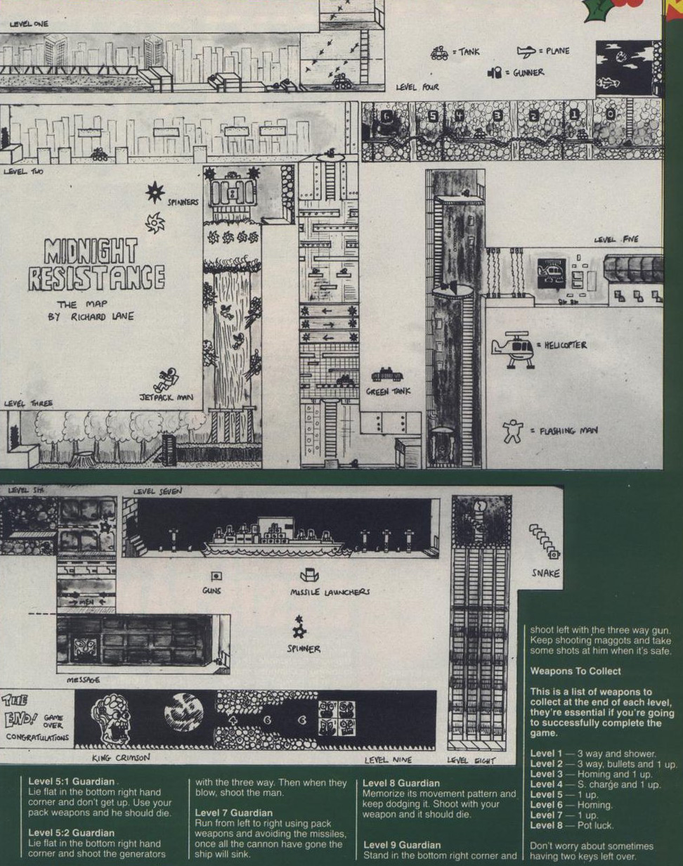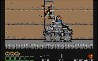 Another clicheè of this kind of games is the end - of - level boss; no self respecting shoot 'em up comes without a few really tough enemies, usually strange, very big or riding some sort of tank; once again, Midnight Resistance is no exception. You' ll have to fight big tanks, burning men sliding up and down a pole, big green things spitting fire bullets, and so on... but then again, it' s OK if you like this sort of things, ain' t it ?