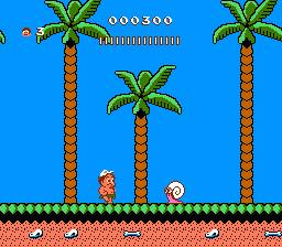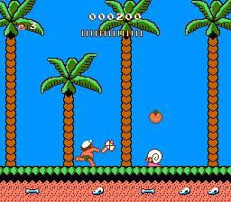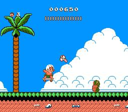 For those not familiar with the mechanics of the Adventure Island series, it's pretty simple. First, take the world of Super Mario and give it an island setting. After that, scrap the timer and replace it with an energy bar, which goes down as time progresses. Helping you out is a generous (or in some cases, quite stingy) amount of fruit and other goodies into each stage, with each of these items capable of adding a bit of length to your lifeline. To ensure you're not helpless against the deadly powers of the many tiny animals trying to prevent you from reaching your goal, weapons also will be included (with a stone hammer being most common in this series) And, of course, the series tries not to vary from the tried-and-true method of sending your hero through a bunch of stages before fighting a boss, moving to the next world (in this case, island) and starting the process again.