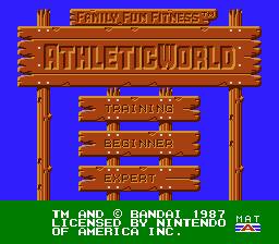 Athletic World is a Nintendo Entertainment System Game that required the use of the Power Pad. You cannot play this game without the use of a Power Pad. There were two different difficulties, Beginner & Expert. There were 6 different levels including Rafting, Dark Tunnel, Animal Trail, Hurdles, & Hop a Log.