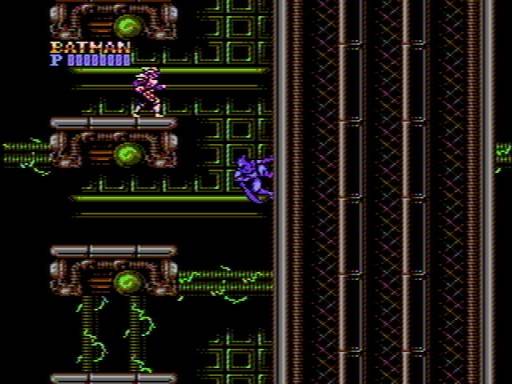 The combat itself is fairly simple, and can be a bit of a pest at times. This is the only reason why the game did not earn a perfect score in this department. It's something that can be rectified by using the 4 button pad of the PSP or using a PC keyboard, but it's still a difficulty. I'm referring to the 3 weapons that Batman carries. Obviously since the NES pad only had 2 action buttons, swapping through weapons with nonexistant shoulder buttons was an impossibility, so you were relegated to hitting the start button to change weapons on the fly, while the select button pauses the game. This swap is a bit of an oddity at first, but it was done simply out of necessity (the start button being closer the action buttons). Other than that nuisance it works out well. The 3 weapons are varied and can be used for harder situations where swooping in and punching an enemy to death is impossible. The first weapon is a gun that fires small rockets straight at the enemy, the second is a boomerang which like any knucklehead knows, you throw and it comes back to you, the third is a shuriken type weapon that you hurl straght at the opponent and splits into 3 weak shurikens that damage a much larger area.