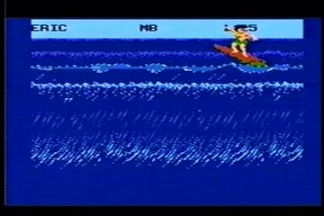 Surfing places the character at the top of a large wave. After the player presses A, the surfer will drop into the wave, at which point left must be held on the D-pad to prevent him from riding off screen into the shark-infested waters. From here on it is simply a matter of tapping either left on the d-pad to move higher on the wave or right on the d-pad to move lower. It is possible to gain height off the wave simply by pointing the board toward the top of the wave and riding up, though landing is a different matter as the surfer must land in exactly the right direction to prevent falling off. No tricks can be performed in the air at all. No grabs, no spins, no grinds along the top of the wave, nothing. This severely detracts from the replay value, and takes what could have been a fun and entertaining event into a very poor one.