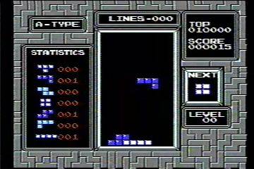 The pieces are made of four blocks arranged into a certain order. You press A and B to rotate the blocks into different directions so they can fit with each other and make straight lines. But that's not all. You may also use one piece to assemble several complete rows at a time. The more rows you complete at once, the more points you get. The best is of course the ''Tetris'' which is done when you complete four rows at once. Every ten rows you get, you go to the next level. At the next level, they will fall slightly faster.