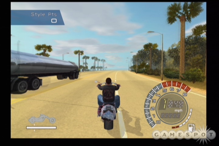 It looks okay, but could be so much better. The characters have lip-synching but are not textured all that well. The cars aren't all that varied in design and colour, so you'll be seeing the same motor over and over again. They often disappear, partly because the draw distance is so craptastic. The bikes are reasonably well designed, and are the graphical highlights of American Chopper. Overall, however, the graphics aren't all that good.